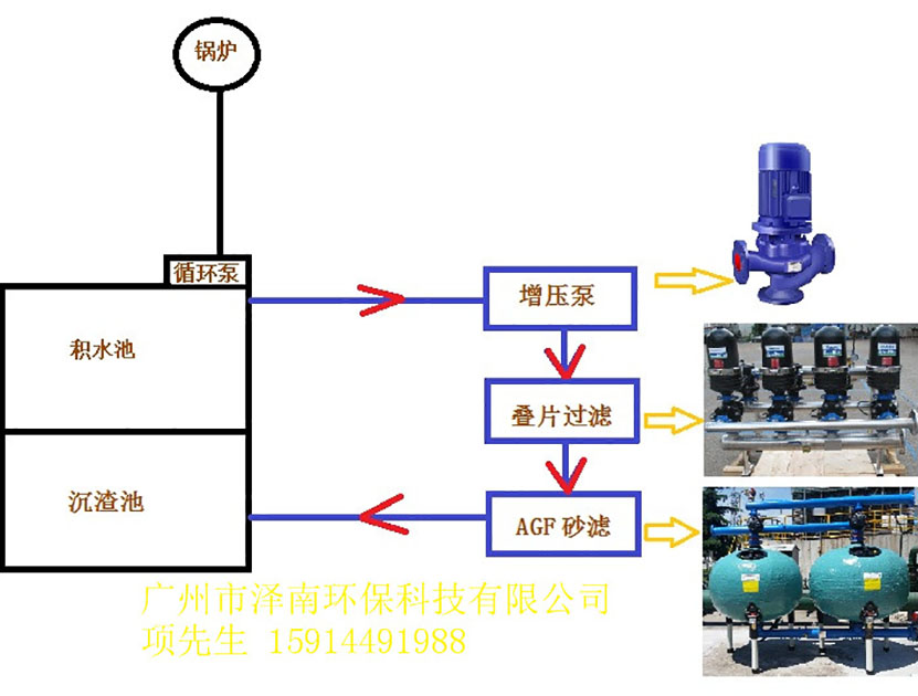 电厂锅炉的冲煤废水(煤灰水、冲灰水)中含有大量非常细小的悬浮颗粒(煤屑),虽经24小时~48小时沉降分离而排水的悬浮物含量一般仍在3000~4000mg/L,有时甚至更高,极大的超出了国家规定的排放标准。若采用常规的絮凝一澄清或絮凝一澄清一过滤等工艺却因占地面积大,技术上可行性差及存在二次污染和无法回收细煤屑而被否定。所以需要在沉淀池旁边增加一套过滤系统,保障冲灰水的多次循环使用,并要求达到保护喷淋喷嘴不被堵塞。