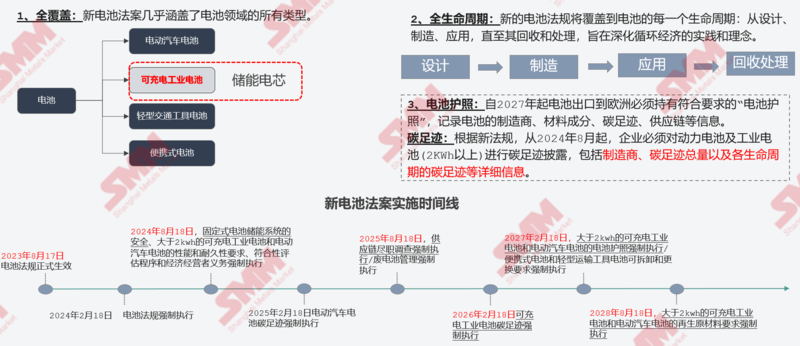 新的电池法规将覆盖到电池的每一个生命周期:从设计、制造、应用,直至其回收和处理,旨在深化循环经济的实践和理念。新电池法还对原材料的碳排放进行了明确划分,原材料进入电池生产工厂前的采矿和预处理过程,以及相应的交通运输等排放均需包括在内。