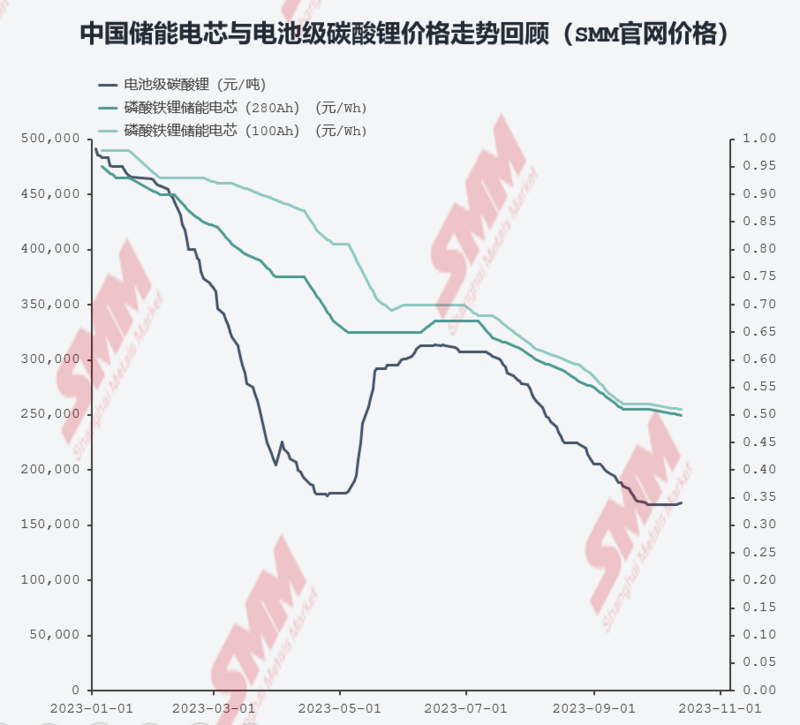 据SMM现货报价显示,进入2023年以来,随着主要原材料碳酸锂的价格整体进入下行空间,叠加市场前期规划产能在今年进入密集投放期,竞争加剧下,储能电芯价格快速下降。今年以来,2小时储能系统价格较年初环比下降34%,2小时EPC环比下降12%。